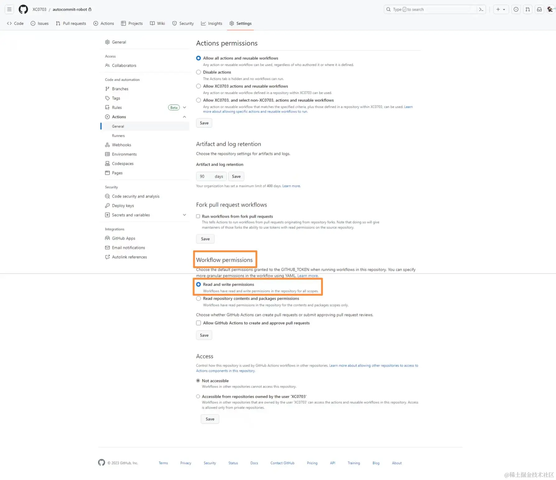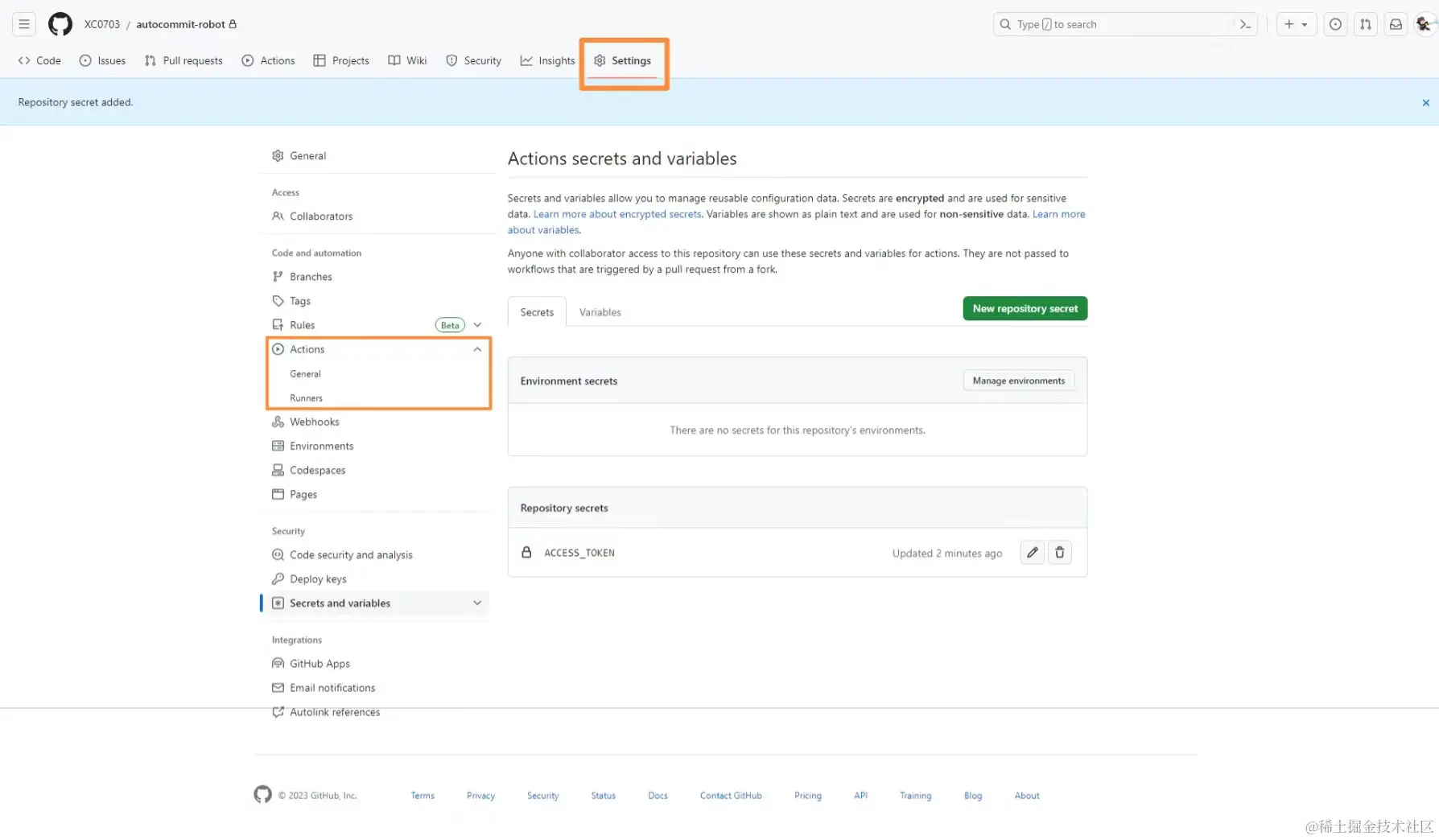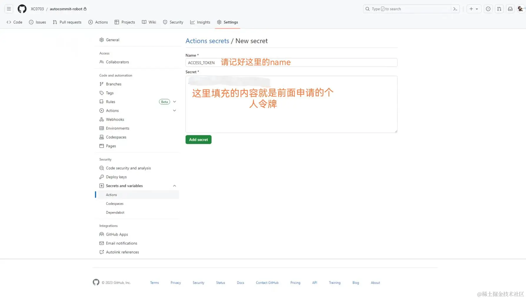 注意:GITHUB_TOKEN: ${{ secrets.ACCESS_TOKEN }}为仓库范围的访问令牌,按照上面链接文章中所讲的步骤去申请一个个人令牌,然后将个人令牌的值存储在GitHub Secrets中(下面会讲怎么设置这个令牌)。这里后面的那个ACCESS_TOKEN为笔者自己的token名称,根据自己的实际情况进行替换,不要照搬。