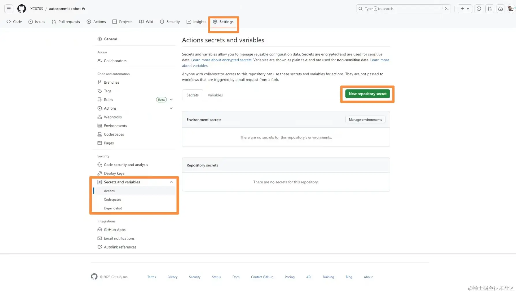 GitHub Secrets存储敏感数据,例如 API 密钥、数据库凭据、访问令牌等,而不是将它们明文写入代码或配置文件中。 - 保护代码安全:通过将敏感数据存储在