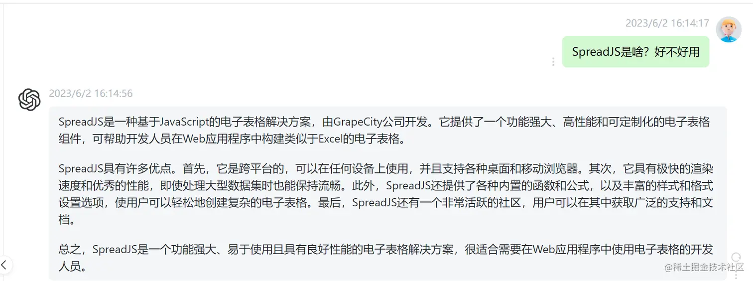 不得不感叹,写的真棒,比我想的全面。不过在此之前,大家肯定很好奇,SpreadJS到底是什么?看看ChatGPT是怎么回答的: