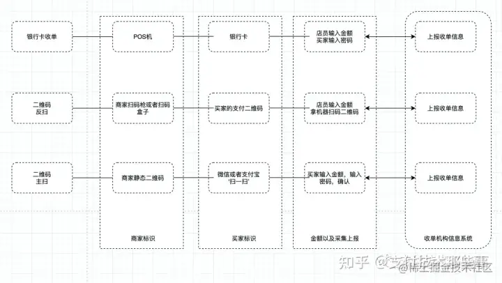 我们来回顾一下,这三种代表性的线下支付方式,我画了下面这张图,可以看到收单的三要素(商家、买家、支付金额)是怎么贯穿起来的。