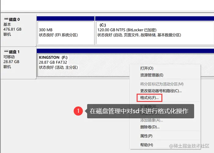 - 在磁盘管理工具中找到SD卡,进行【格式化】操作。