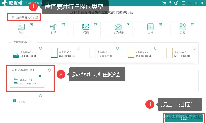 - 在界面中选择需要恢复的文件类型(如果想进行全面的扫描,勾选所有文件类型),并勾选sd卡的盘符,最后点击 【扫描】 ;
