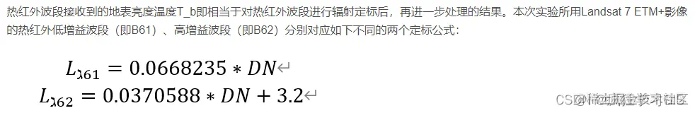 此外,由于两个波段具有不同的增益,因此二者在辐射定标时,对应的定标公式也是不一样的,如下图所示;具体在文章# Landsat 7地表温度单窗算法反演的ENVI、ERDAS实现中有所介绍,大家可以参考。