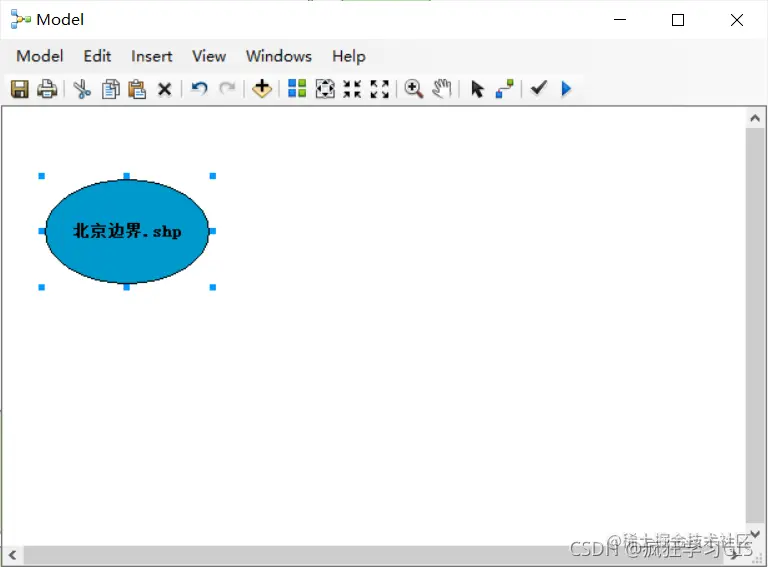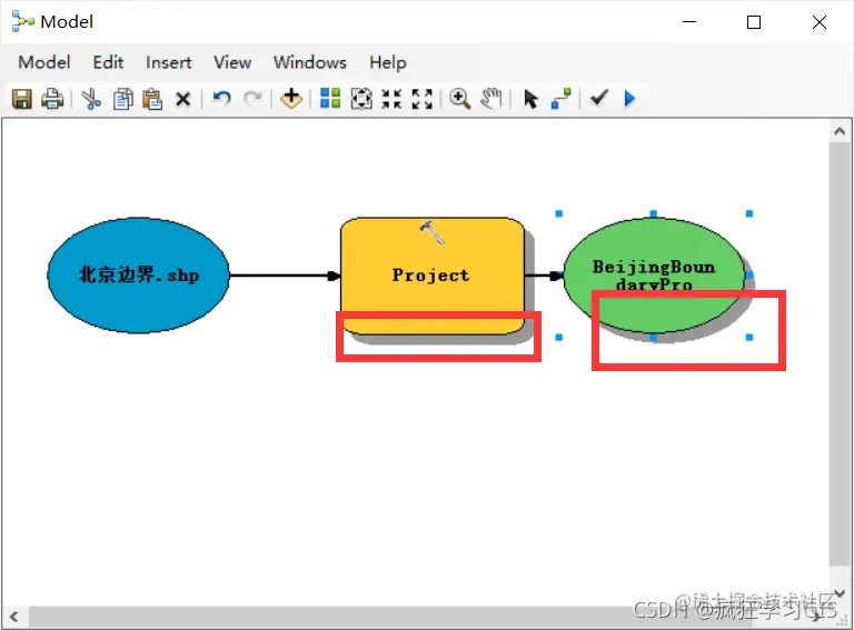 接下来,我们导入前文提及的第二种素材——模型具体的操作工具。导入工具有两种方法:如果要导入的工具是ArcGIS自身已有的工具,那么我们可以直接将其从“Catalog”窗口中拖动到“Model”窗口中;而如果该工具是类似于文章ArcMap将Python写的代码转为工具箱与自定义工具中提及的自定义工具,那么我们可以通过前文提到的“Insert”→“Add Data or Tool... ”方法来导入。