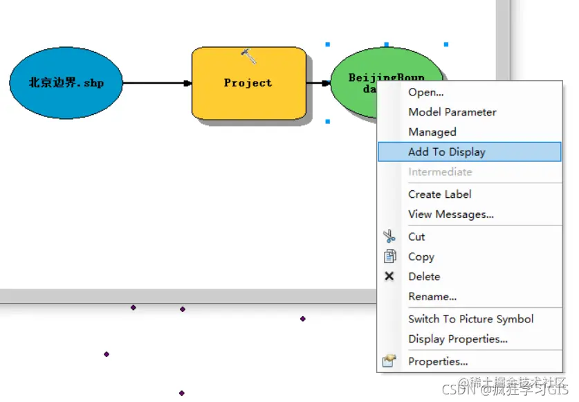 在输出结果数据上右键,选择“Add To Display”,即可将该数据图层显示在ArcMap中。但这个功能似乎不太稳定,我的电脑上点这个按钮,不知道为什么图层并不会显示。