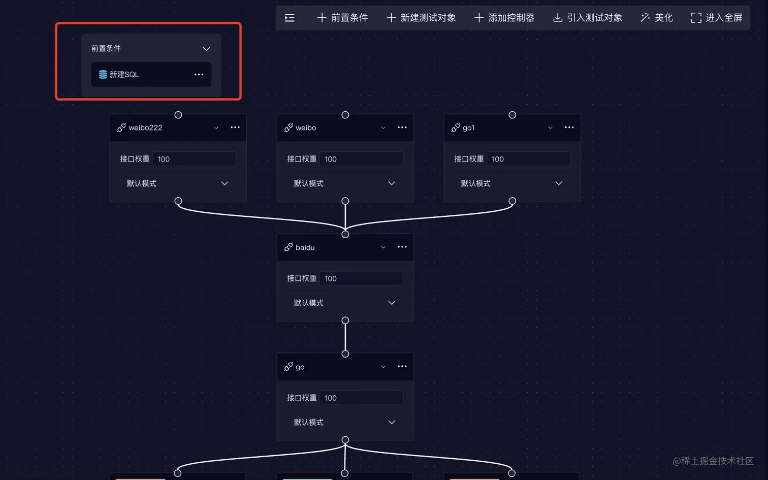 RunnerGo自研可视化场景配置,在配置时用户可以在场景画布上连接API,创建等待控制器、条件控制器来组建一条完整的场景流测试,支持添加前置条件,可以从数据库中获取真实的用户数据。
