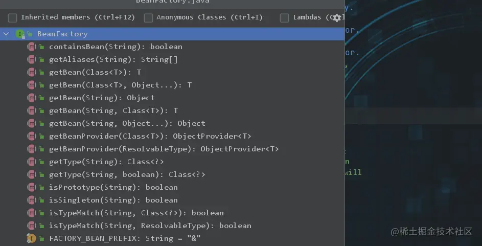 该接口主要提供了containsBean,getAliases,getBean等方法