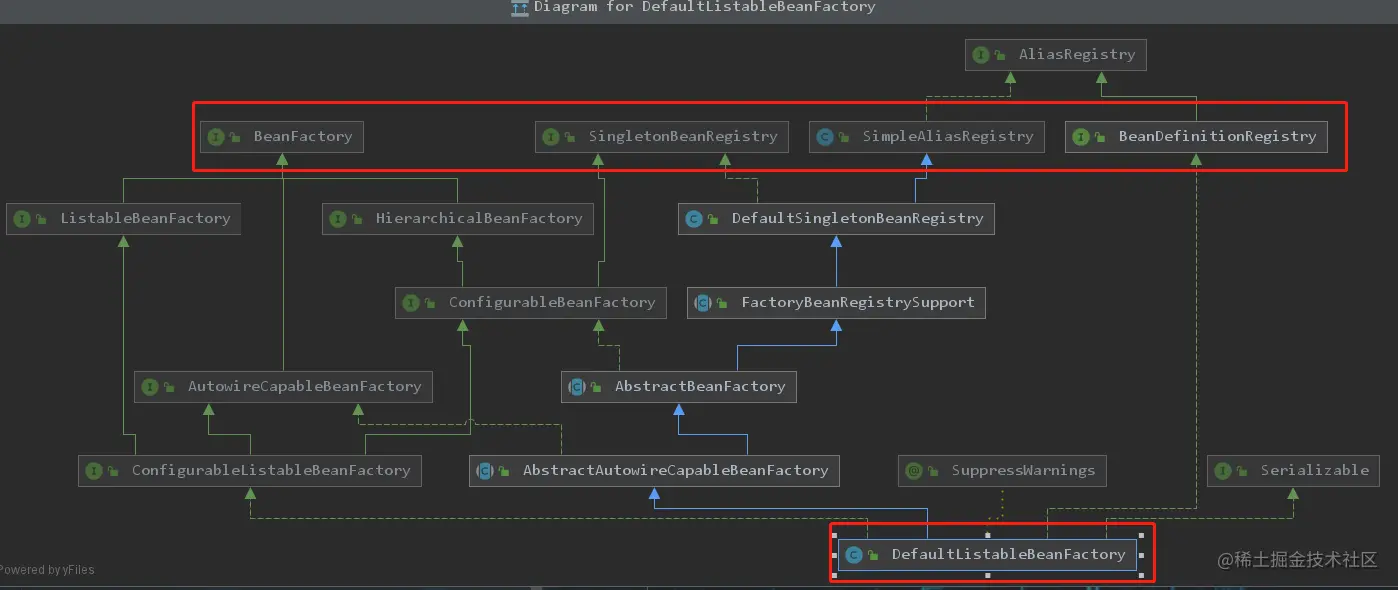DefaultListableBeanFactory是BeanFactory的一个实现类,其不仅实现了BeanFactory的方法,也实现了其他接口或方法。