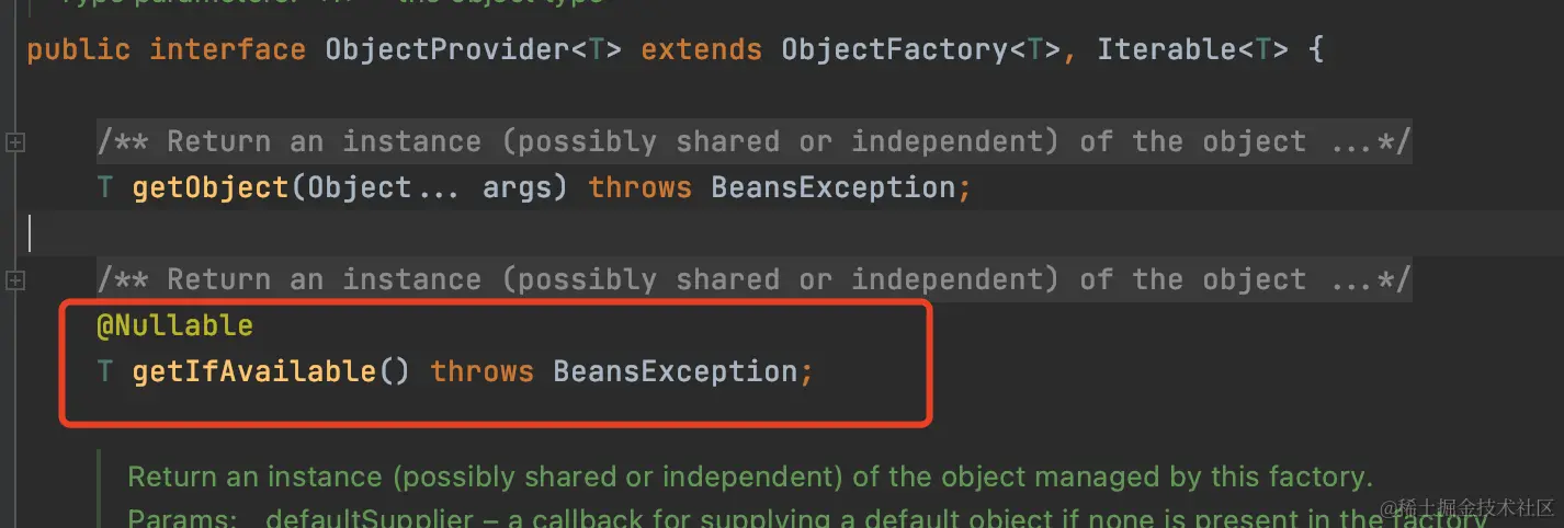 但是ObjectProvider额外提供的getIfAvailable方法就支持获取不存在的对象的功能,当通过getIfAvailable获取的对象不存在时,只会返回null,并不会出抛异常。