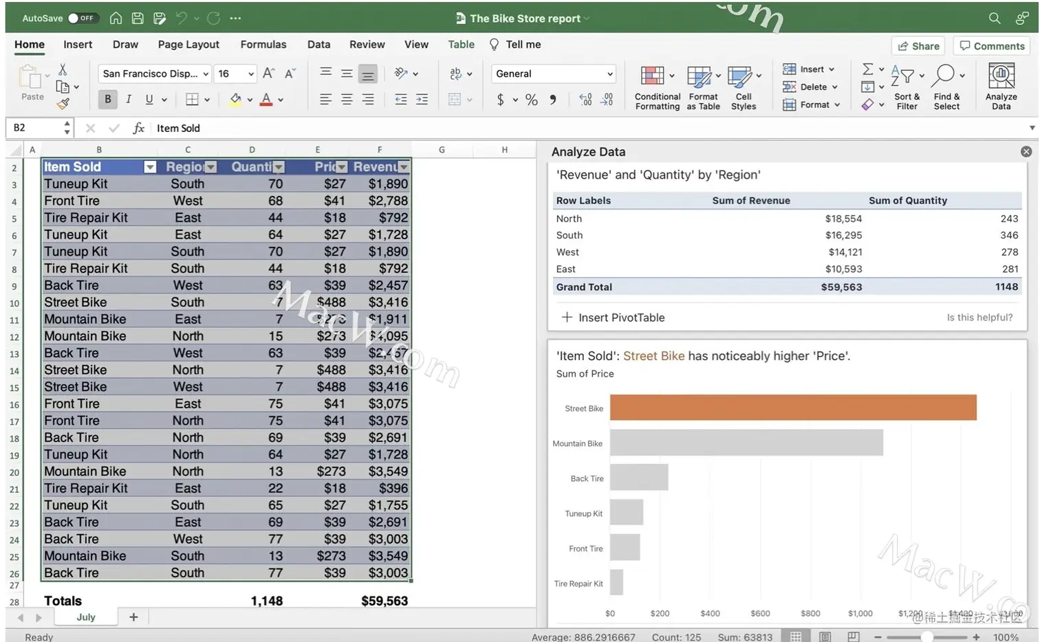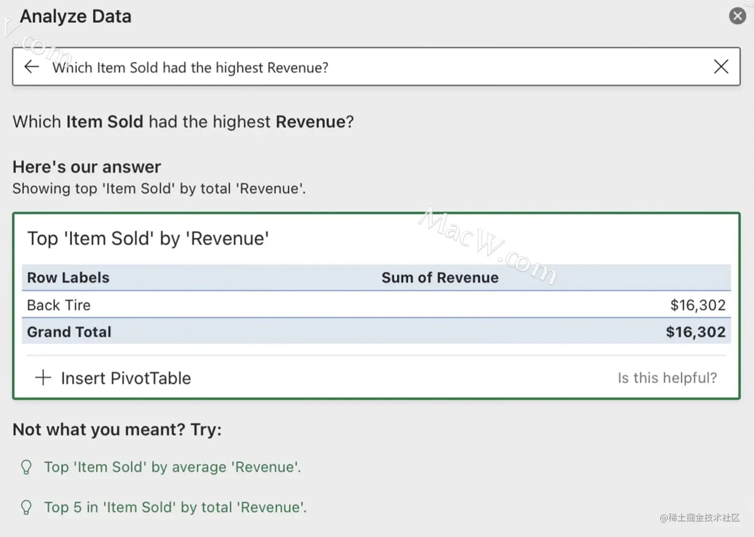 使用“分析数据”:在分析数据面板顶部的文本框里使用自然语言向《EC》提出问题(暂不支持中 文)。例如,对于上图的数据表,你可以问:“Which Item Sold had the highest Revenue?”(哪种已出售商品的销售额最高?)《Excel》)给出的答案也许会让你感到意外一“Back Tire”(后胎):