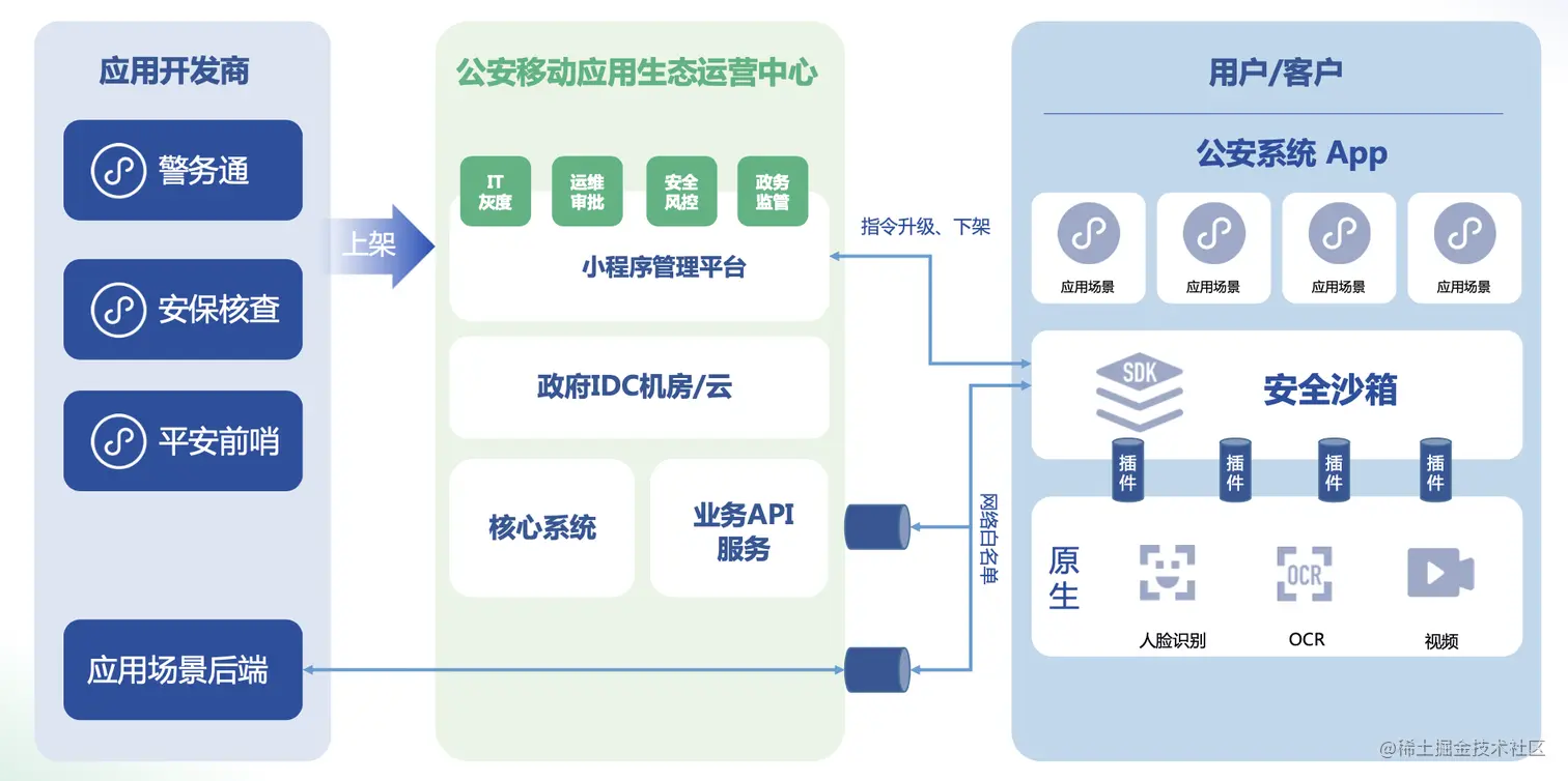 利用 FinClip 小程序技术打造开放移动警务生态,智慧警务内外部合作伙伴的应用场景(例如:社保查询、营业执照查询、证件办理、本地资讯、融媒直播等),可以以小程序方式“提交”入驻至警务App中,由警务运营人员对小程序应用场景进行统一审核上架,有效降低对接成本,对用户而言也可以在一个App内,满足多种政务场景的需求。