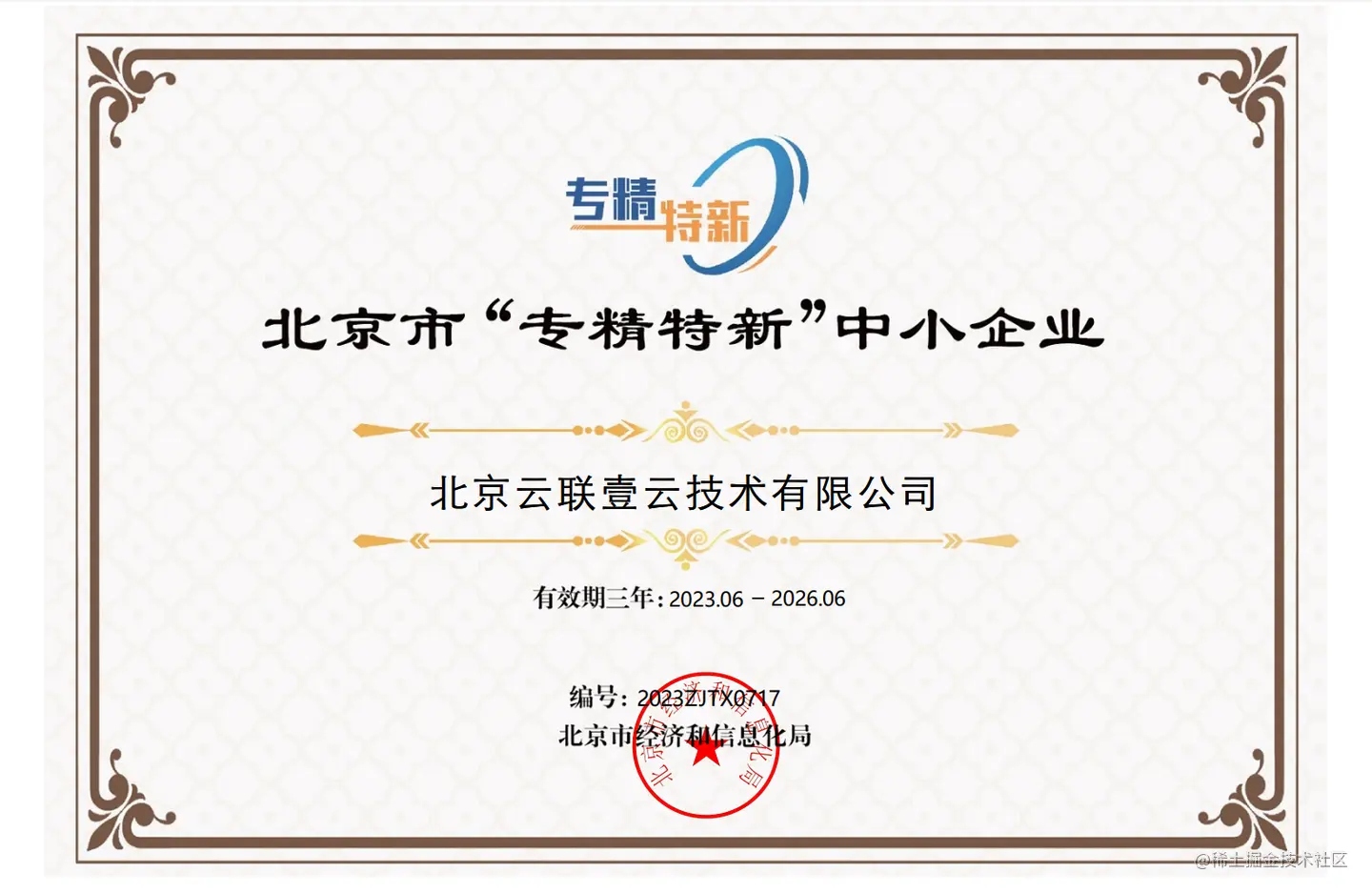 6月25日,北京市经济和信息化局发布《关于对2023年第一季度北京市专精特新中小企业名单进行公告的通知》,北京云联壹云技术有限公司入选2023年北京市“专精特新”中小企业。