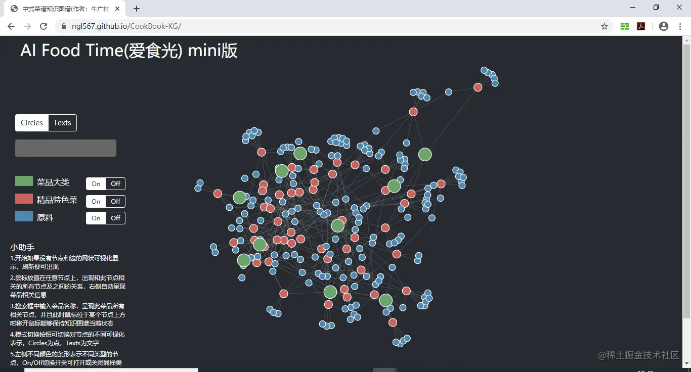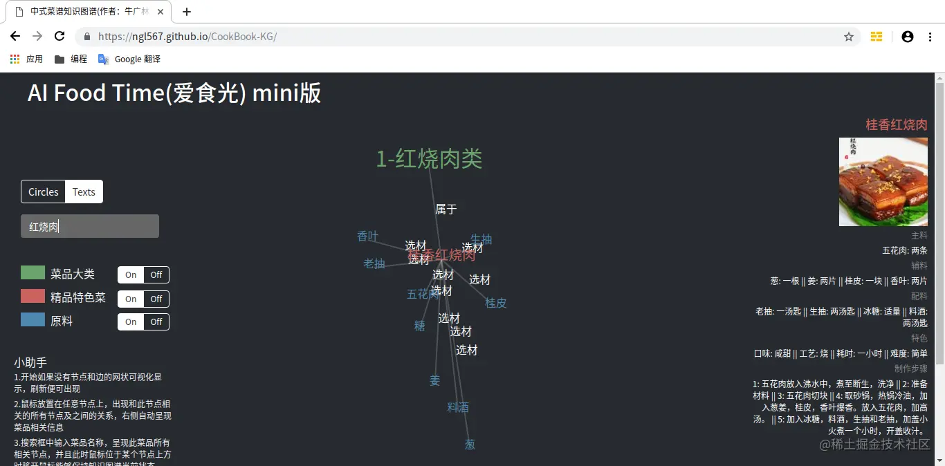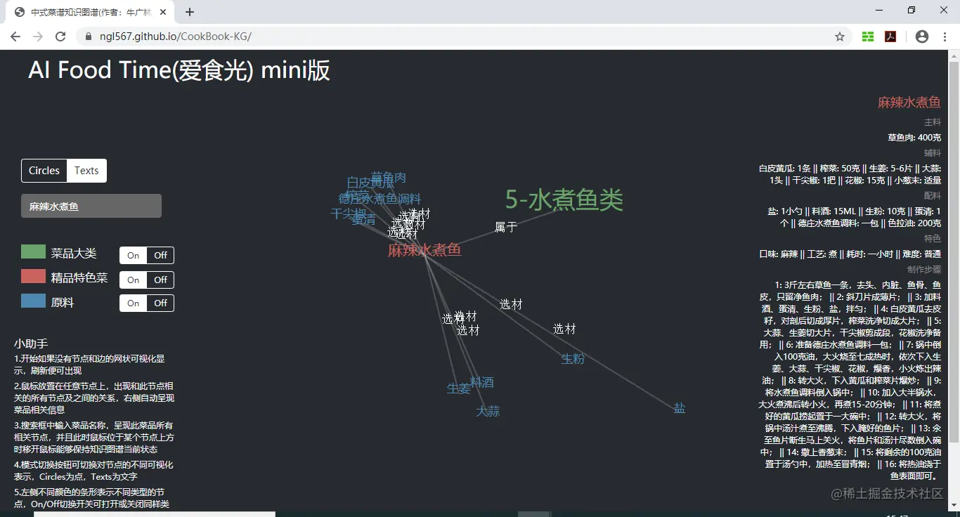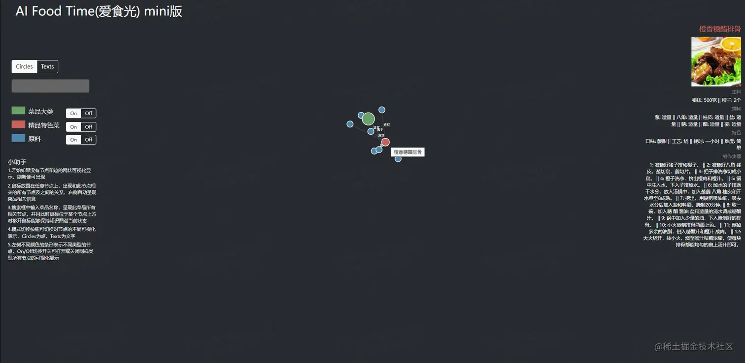 - mini版:包含10大类,50种菜品之间的关联关系,包括菜品制作的各种食材和制作步骤,轻量级的mini版同时支持电脑和手机浏览器打开,如需体验可直接进入访问入口。