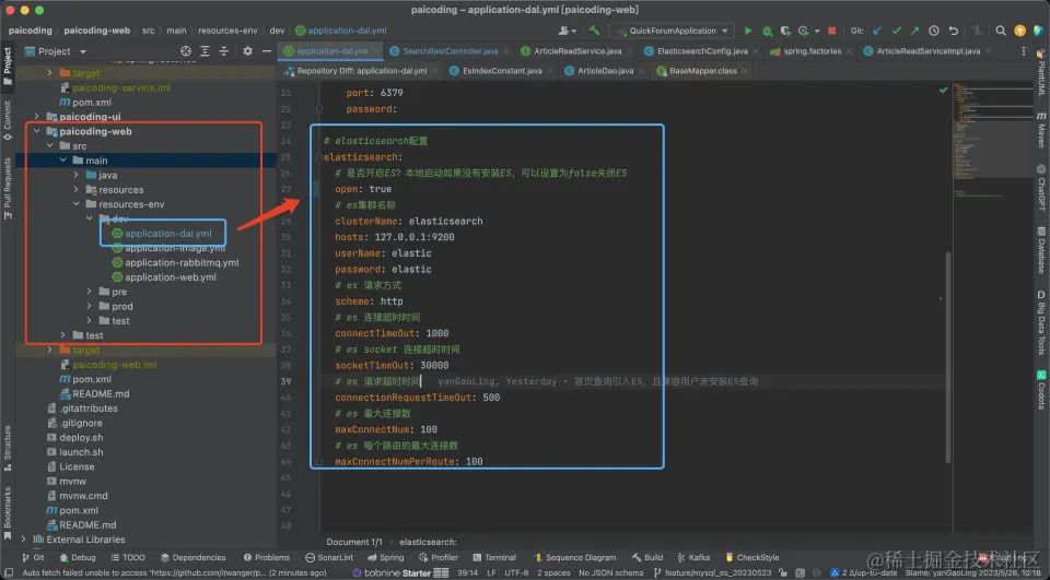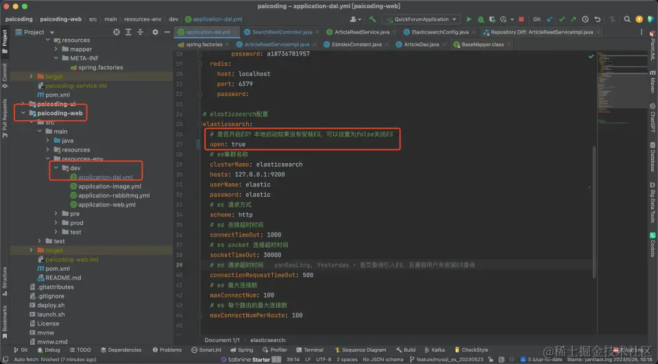 在 paicoding-web 模块中 src->main->resource-env->dev->application-dal.yml 中配置 ES 相关配置,配置如下所示: