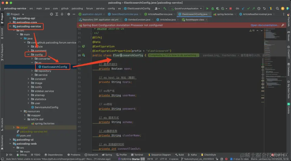 其实配置类中也就是构造 RestHighLevelClient 客户端。注意是放在 paicoding-service 模块中。