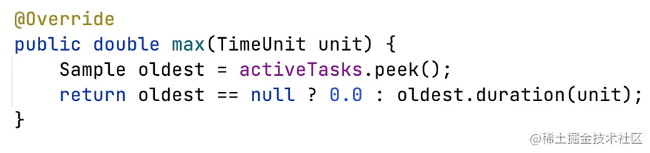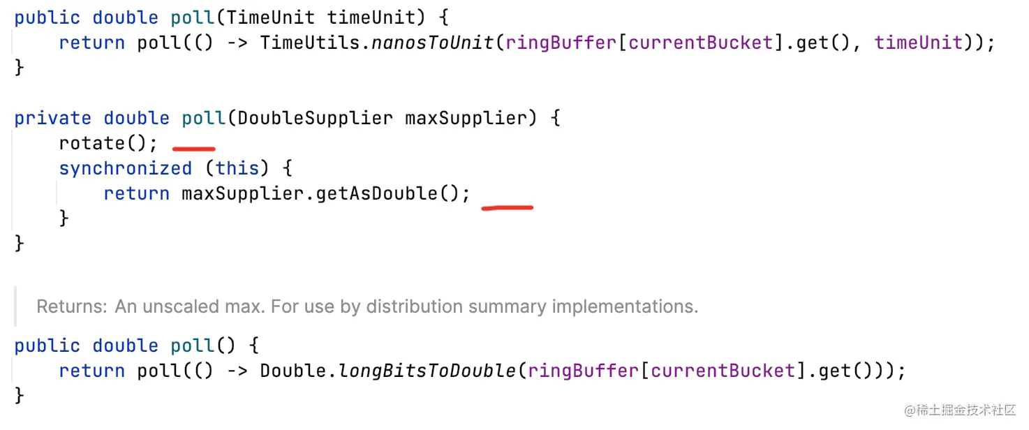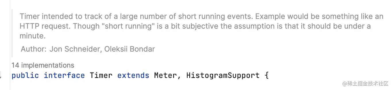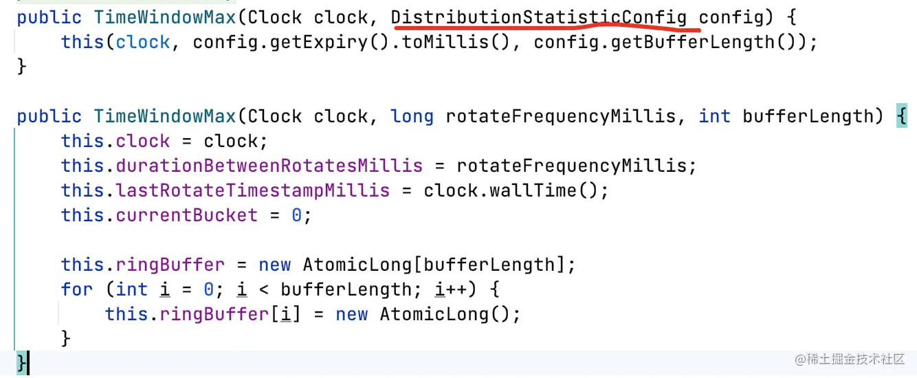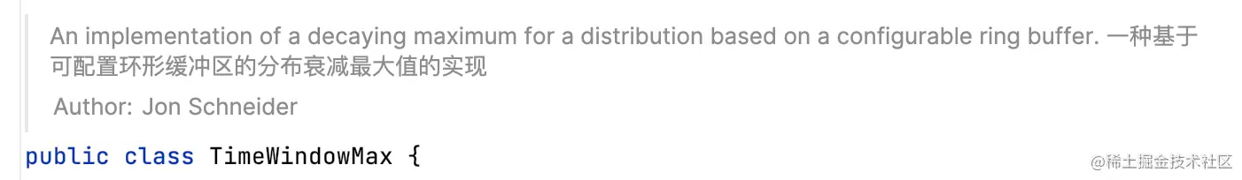 - Timer:用于跟踪大量短时间运行事件的计时器,包含三个度量count总数、totalTime总耗时、max最长耗时。其中max默认统计的是3分钟内的最大值,基于环形数组实现,数组容量bufferLength=3,每个元素代表时长expiry=1分钟。支持Histogram,依托Histogram支持Exemplar;