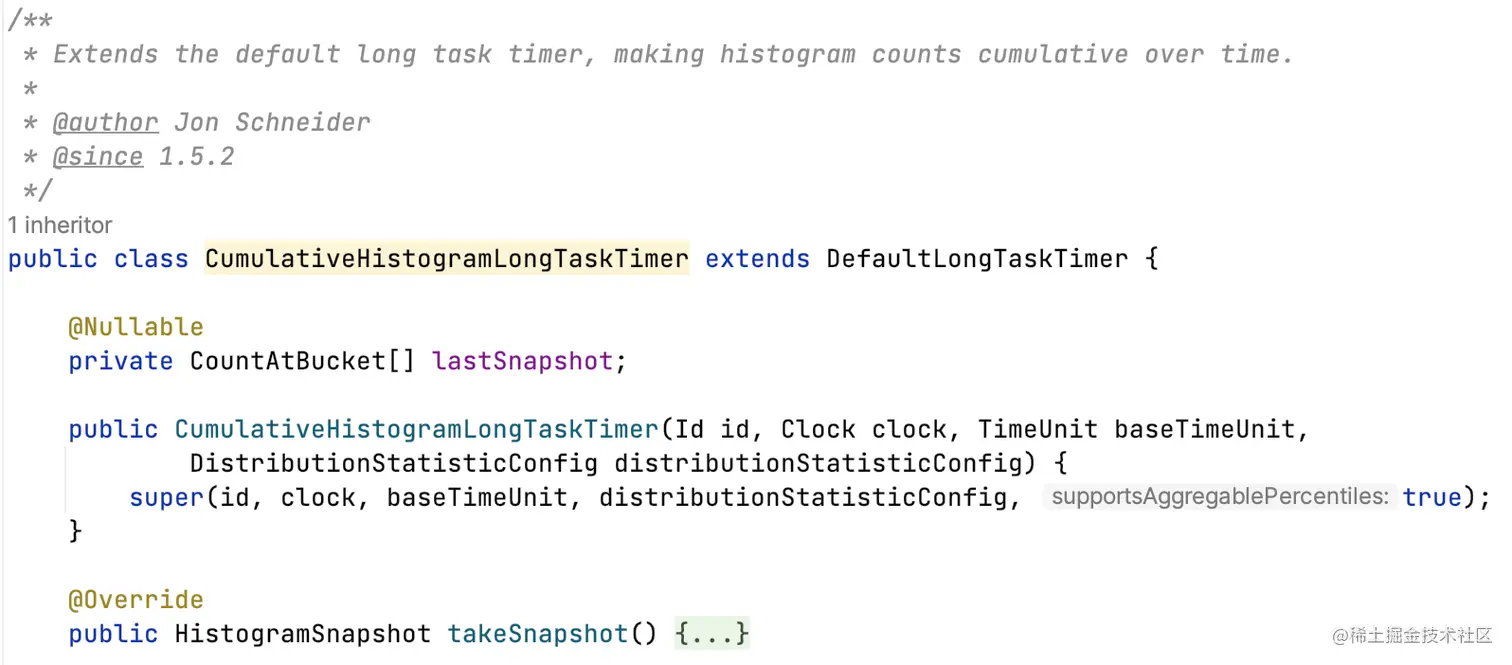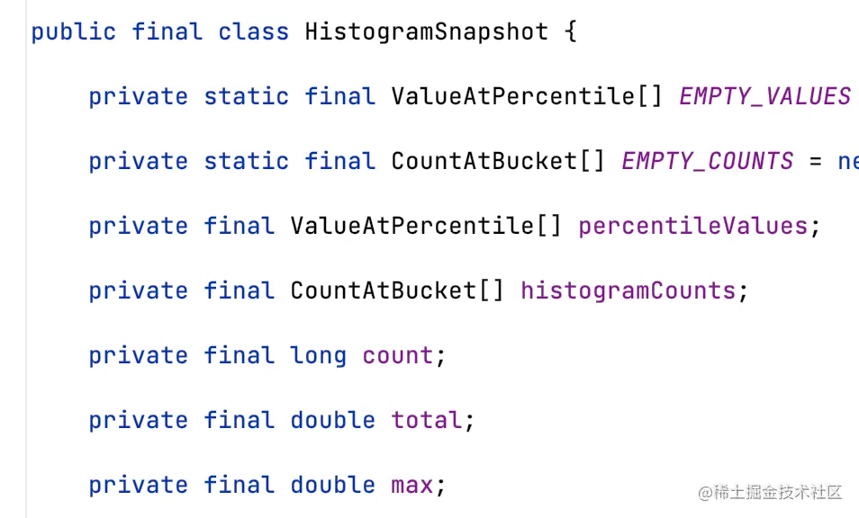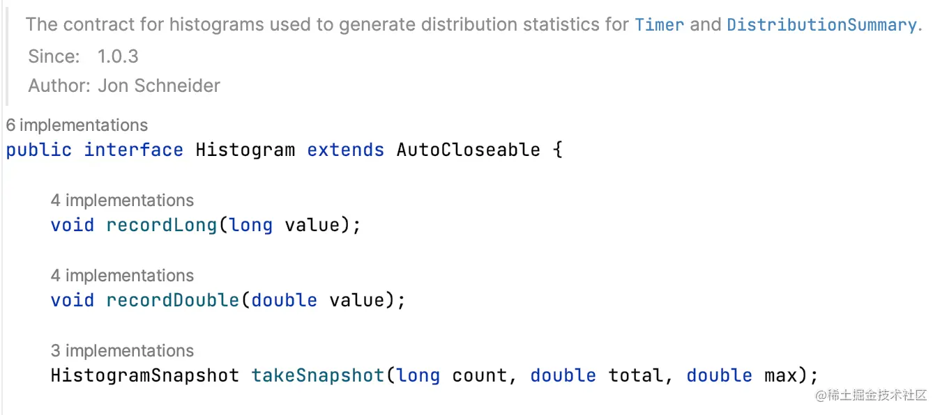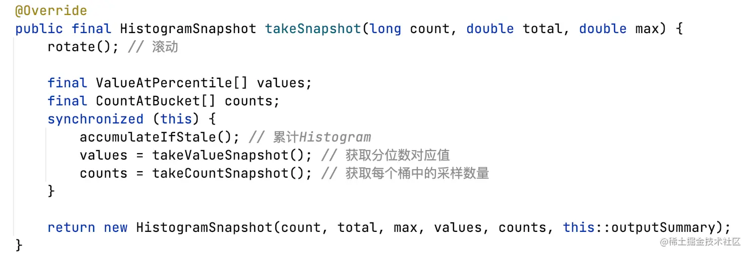 Histogram自身具备takeSnapshot能力,所以一般Timer和Summary都会委派底层Histogram生成快照。