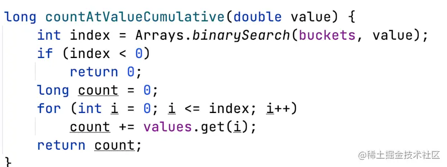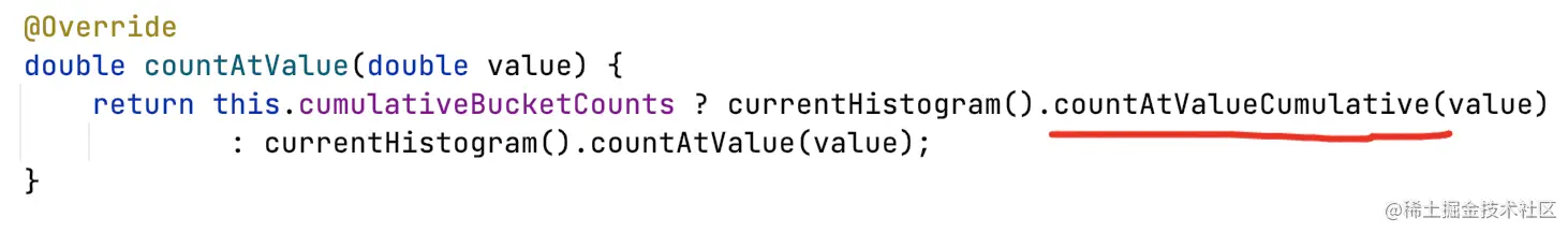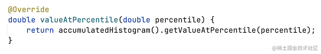 因为Prometheus只用这里的分位数值,所以只用看valueAtPercentile,调用DoubleHistogram#getValueAtPercentile这个api即可。