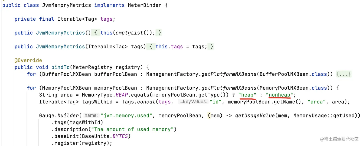 比如:Jvm内存分堆和非堆,那么使用MeterBinder在ioc容器启动阶段就可以注册Meter了。