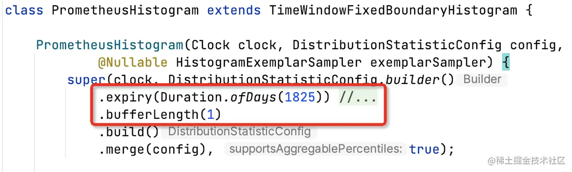 - 桶计数:percentileHistogram=true开启桶计数,桶数量由minimumExpectedValue和maximumExpectedValue确定。在Prometheus场景下,桶计数需要累计整个进程生命周期中的所有计数,底层TimeWindowFixedBoundaryHistogram维护了一个永远不滚动的1容量的环形数组;