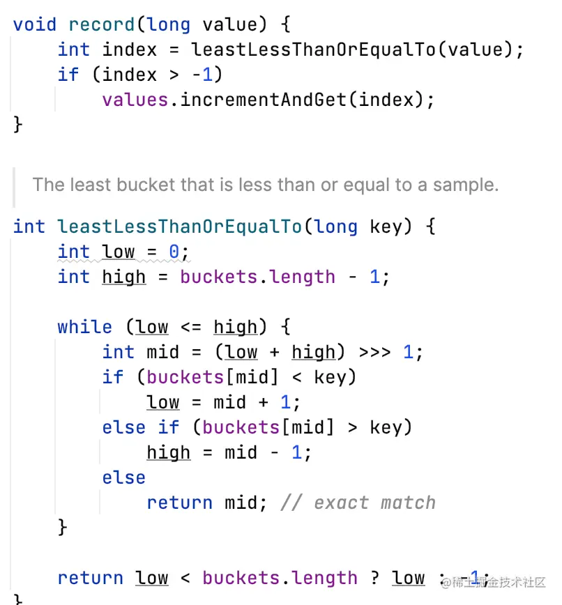 - 从bucket数组中,找到最大的小于等于采样值的bucket下标(算法题二分查找变形);