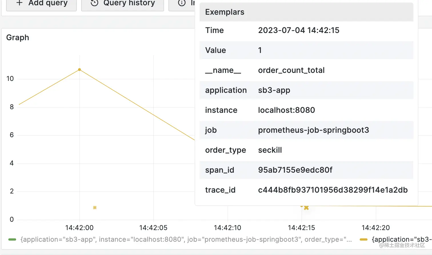 在grafana侧,可以通过metric拿到Exemplar,而Exemplar中包含trace_id,方便定位问题。