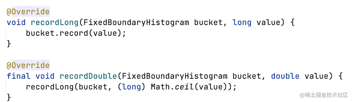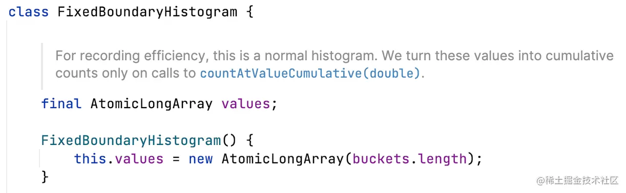 FixedBoundaryHistogram维护了一个和bucket长度一致的原子长整型数组values。