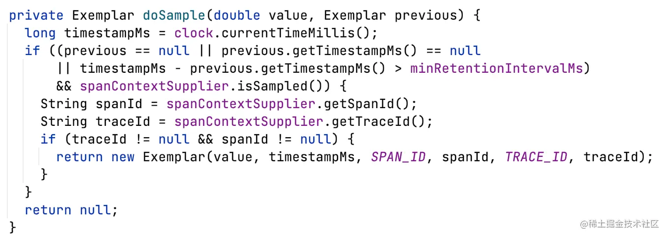当满足下面两个条件的情况下,才会采集新的Exemplar,Exemplar包含当前线程中的trace信息
