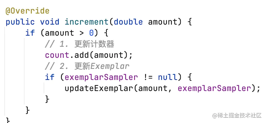 每次increment都会调用CounterExemplarSampler采集一个Exemplar,替换Counter中的Exemplar。