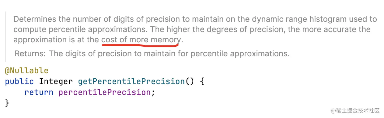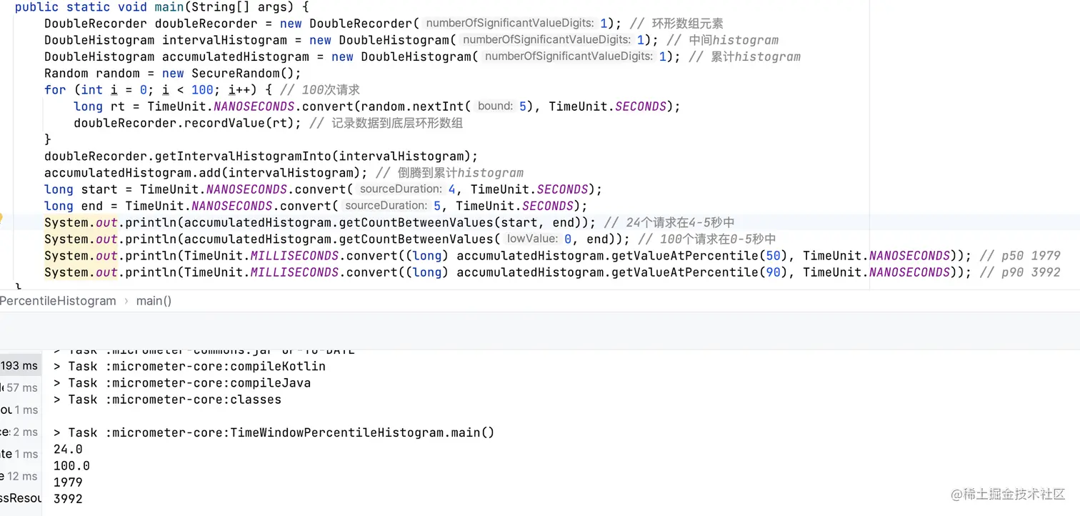 - 分位数值:percentiles非空开启分位数值记录,分位数值数量由percentiles确定。收集时会将当前时间窗口内的计数,灌入累积Histogram,底层使用三方工具HdrHistogram实现;