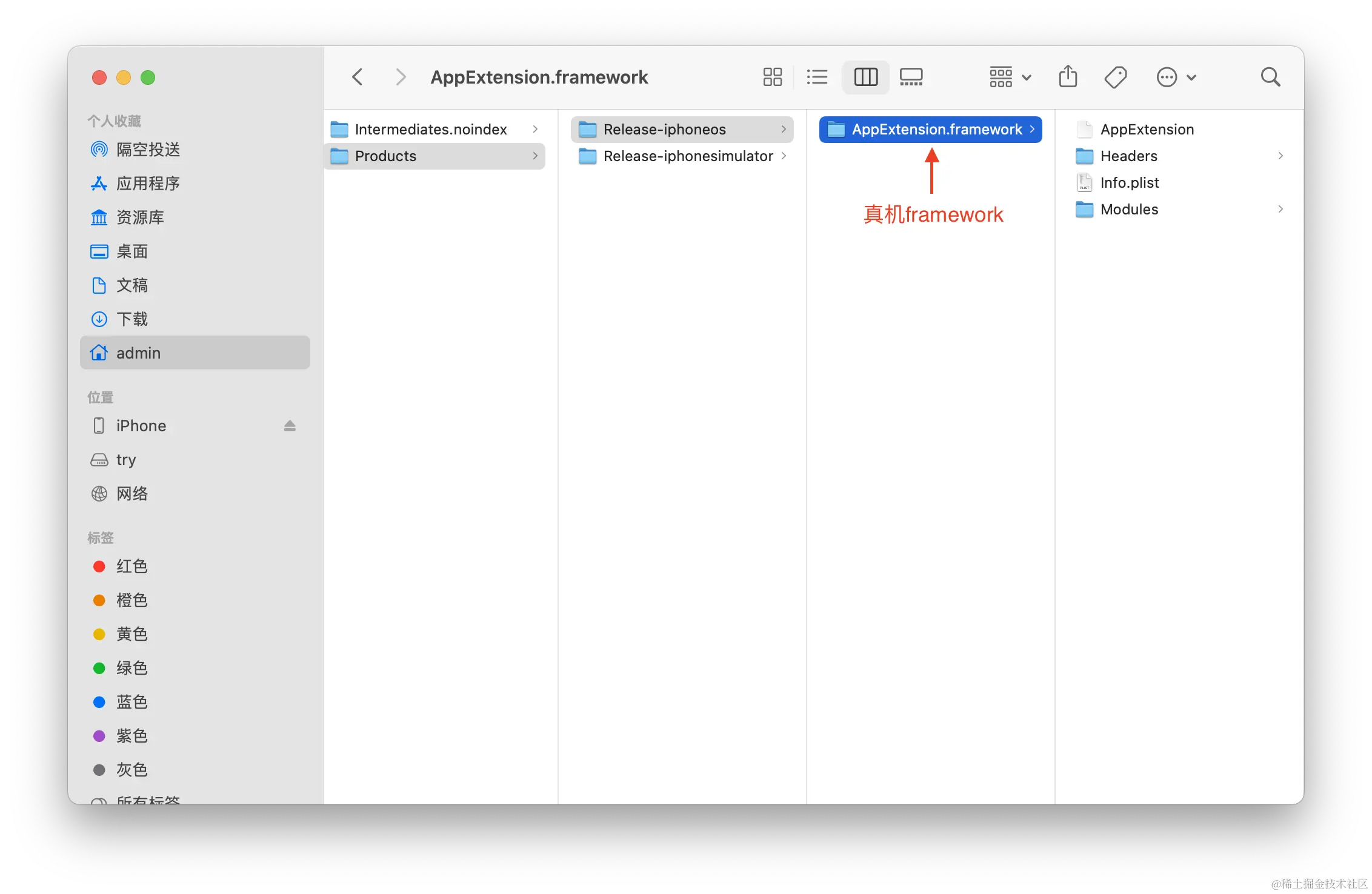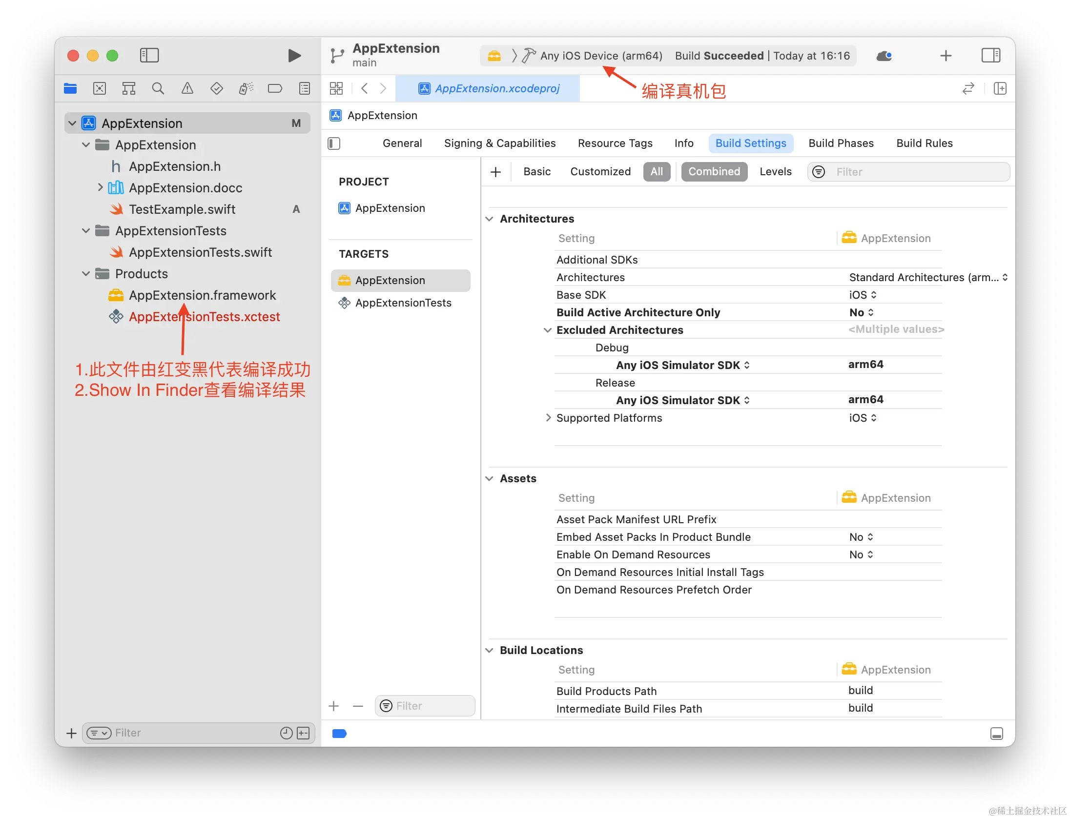 分别选择模拟器和真机进行编译(command+B),编译成功后会生成对应环境的 framework
