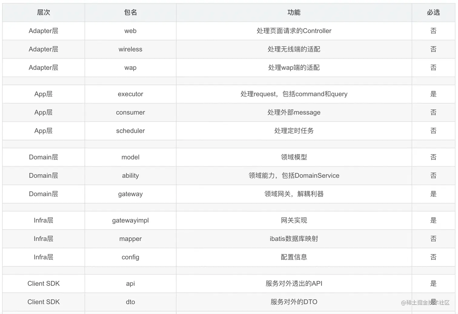 对于一个典型的业务应用系统来说,COLA会做如下层次定义,每一层都有明确的职责定义: