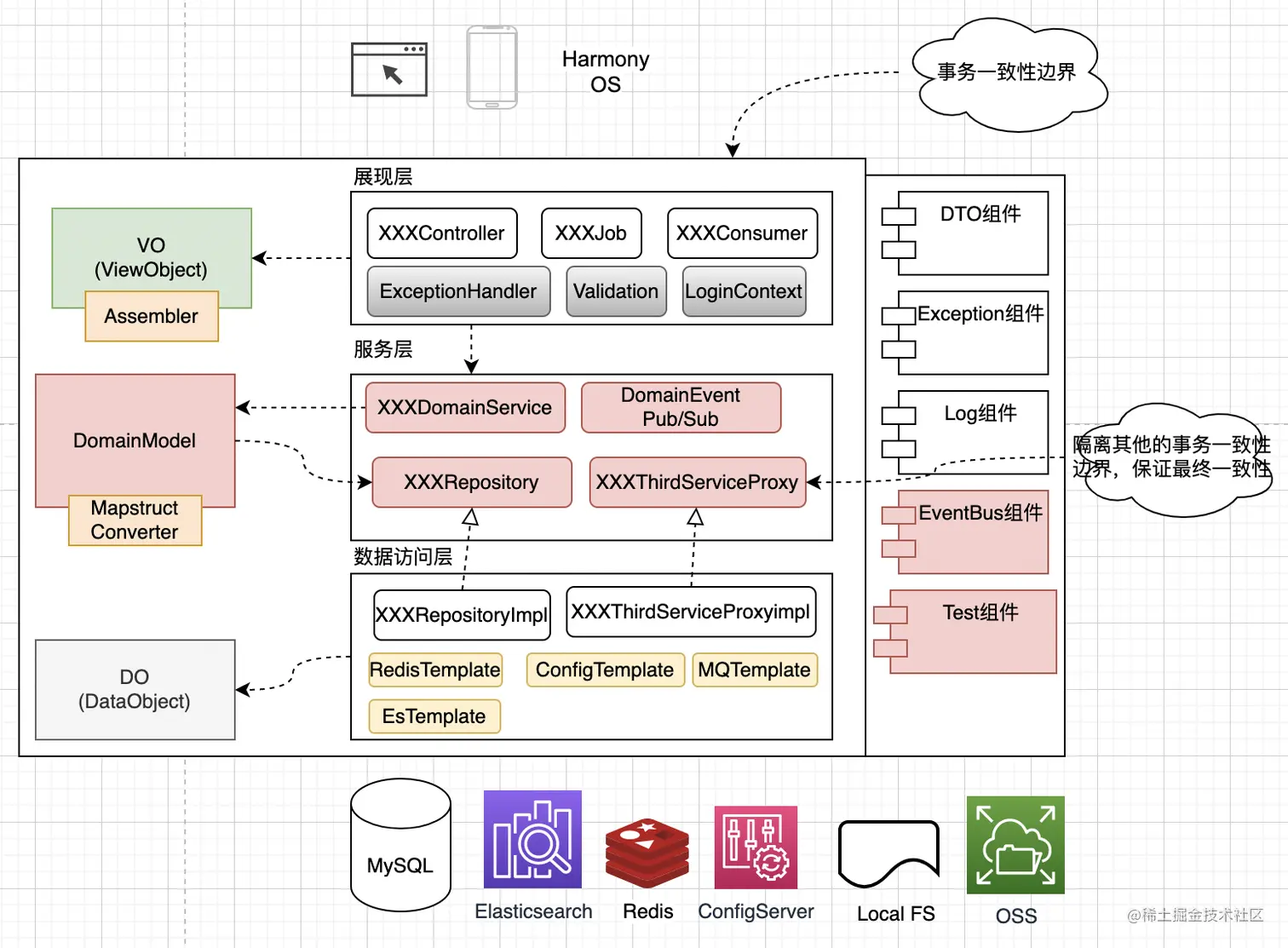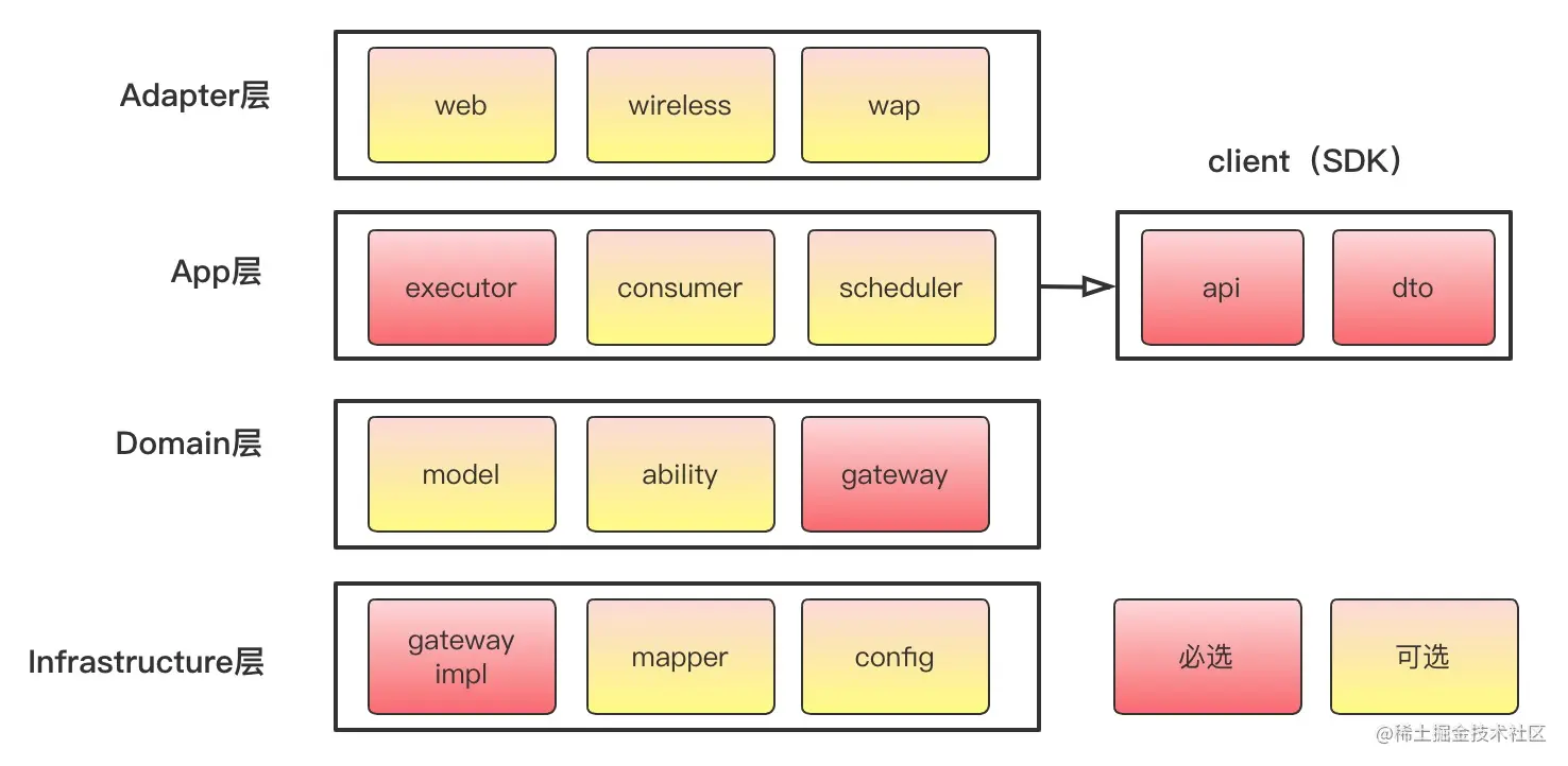 - 基础层贯穿了DDD所有层,包括第三方工具,API网关,消息中间件,分布式事务,消息最终一致性能力,数据库,缓存能力的提供。
