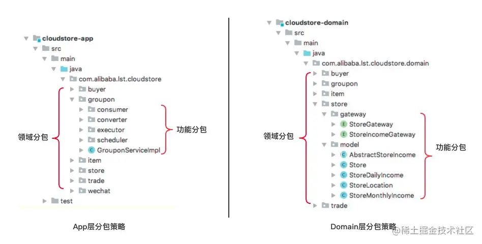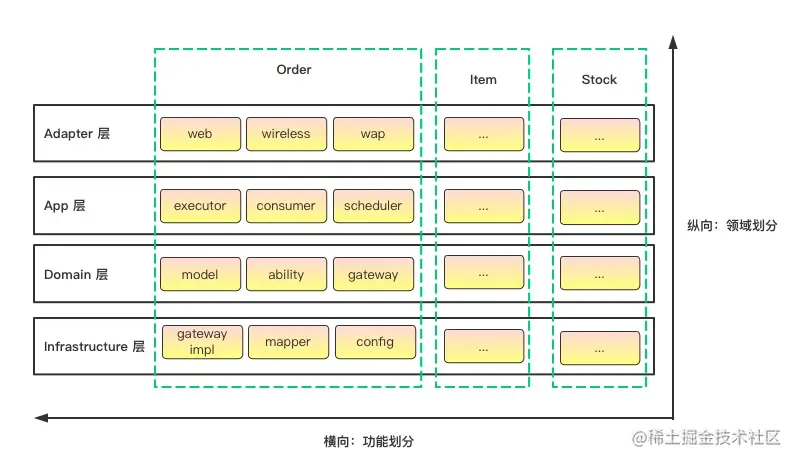在每一层中顶层按照领域分包,在领域内按功能分包。