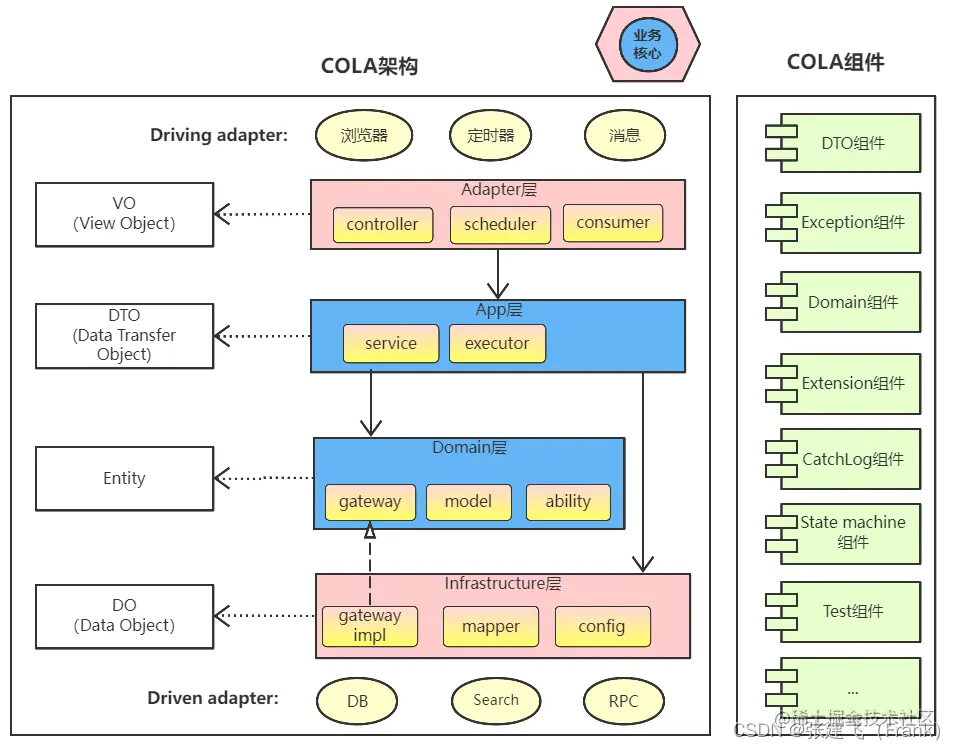 COLA是阿里的张健飞老师基于分层架构、六边形架构、DDD架构思想创办一个应用架构最佳实践。我们会发现它具有一定的普适性,可以指导我们应对业务场景的一些共性问题。