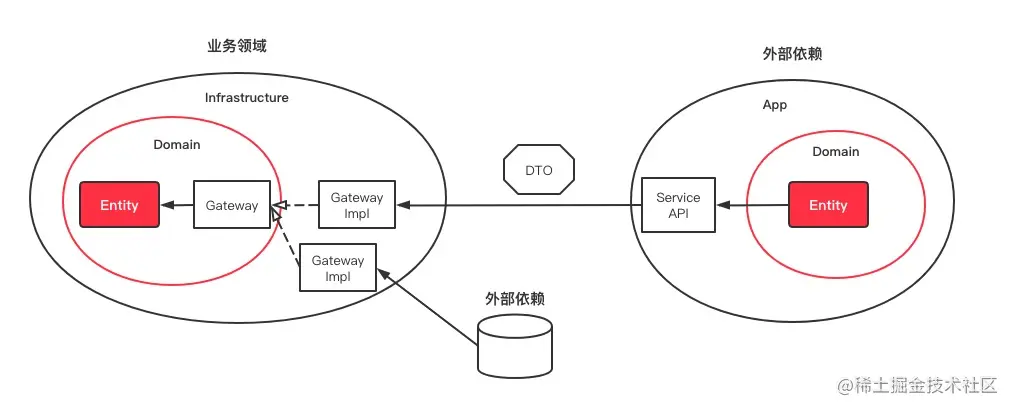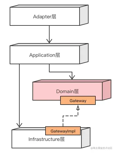 其实现方式如下图所示,主要是在Domain层定义Gateway接口,然后在Infrastructure提供Gateway接口的实现。