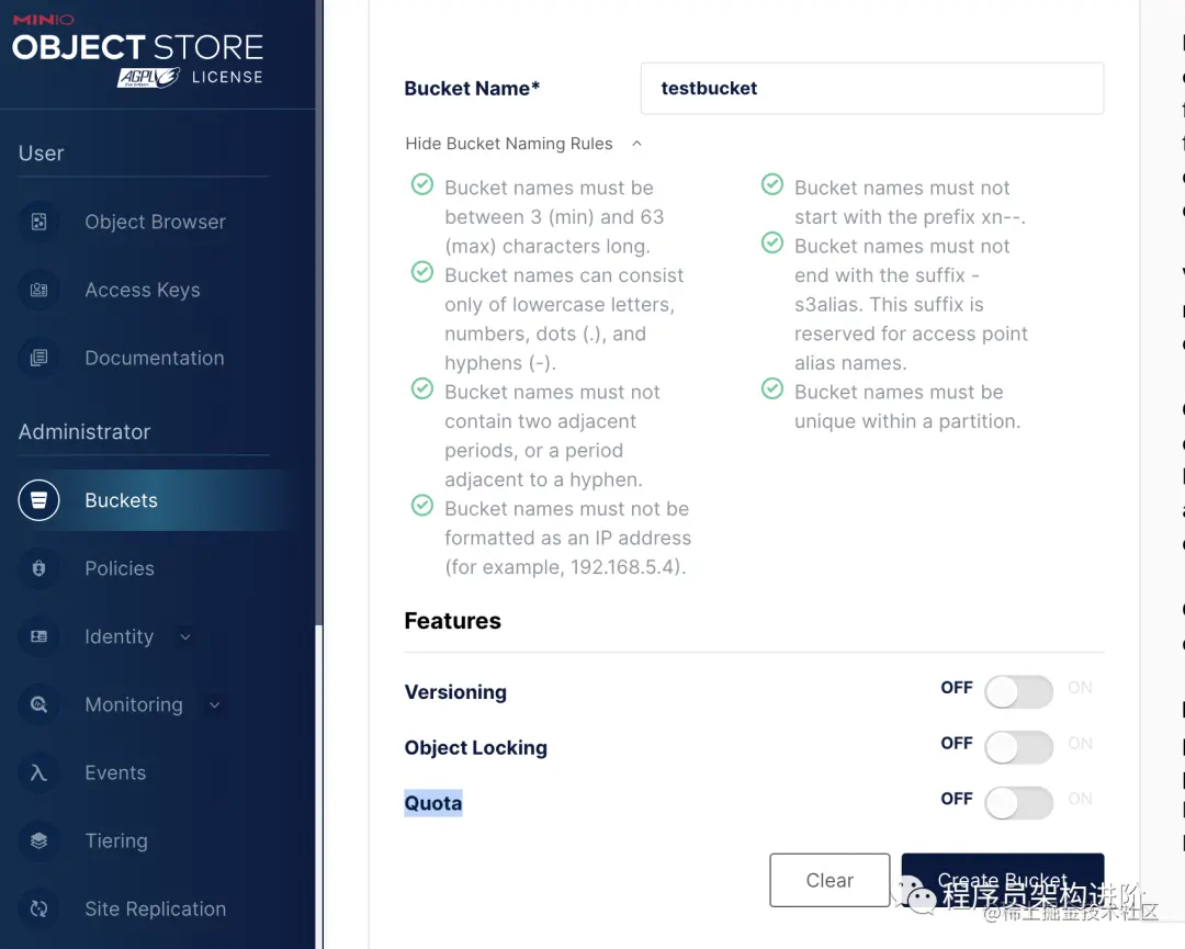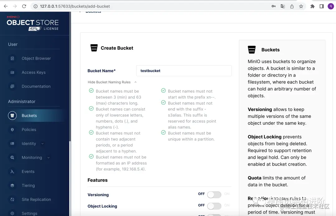 接下来就是熟悉的对象存储通用操作,创建bucket和上传文件了。Minio对bucket的命名有如下图中的要求。这里主要提两点,(1)长度最小3最大63;(2)只能使用小写字母、数字。虽然写着可以用. 和 -,但实际使用时发现会报错,直接复制也不行。