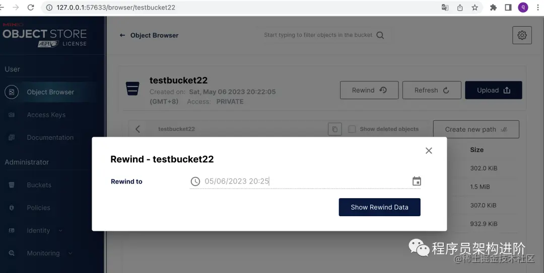 Rewind,倒回。有点“回滚”的意思。这里是在上一部创建bucket时,选择了打开Versioning(版本管理)带来的功能。如下所示,可以回到指定时间点的数据。