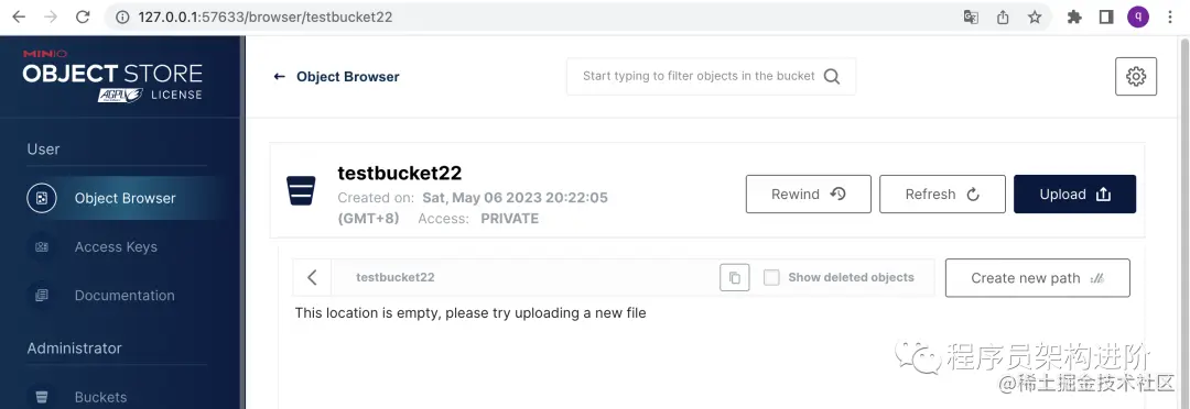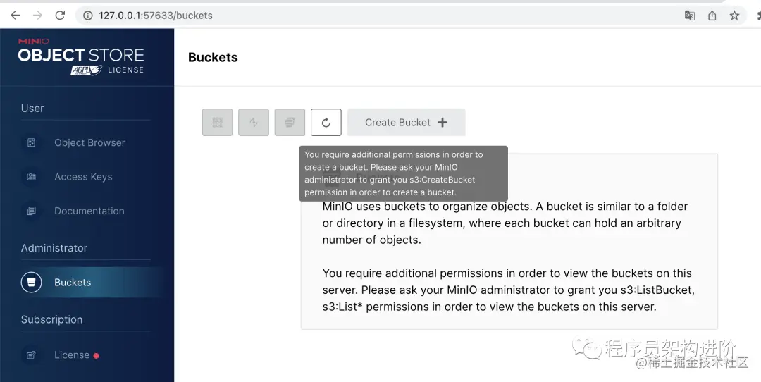 点击查看Buckets时,发现Create Bucket是灰色,无法操作。并且在下方提示是权限问题。这里又 比较奇怪,刚刚我们设置的应该就是管理员的账号和密码,这里不应该出现。在退出登录再重新登录后,也刷新了一次页面,展示正常。看来是浏览器/页面服务的缓存问题,不知道算不算是一个bug。