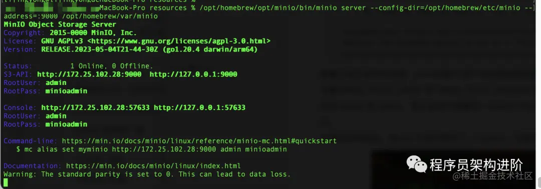 非brew方式,直接启动:/opt/homebrew/opt/minio/bin/minio server --config-dir=/opt/homebrew/etc/minio --address=:9000 /opt/homebrew/var/minio