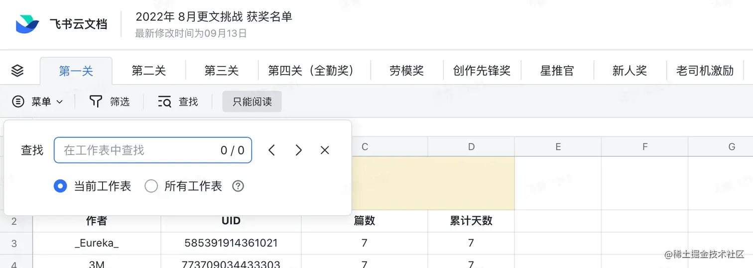 如何快速找到自己:进入飞书表格后,使用 Ctr+F 搜索自己的用户名或 user id,选择“所有工作表”( user id 即 juejin.cn/XXXXXX 最后的一串数字)。之前打开过本表同学请刷新表单,奖项或有增补,以最新的表格为准。
