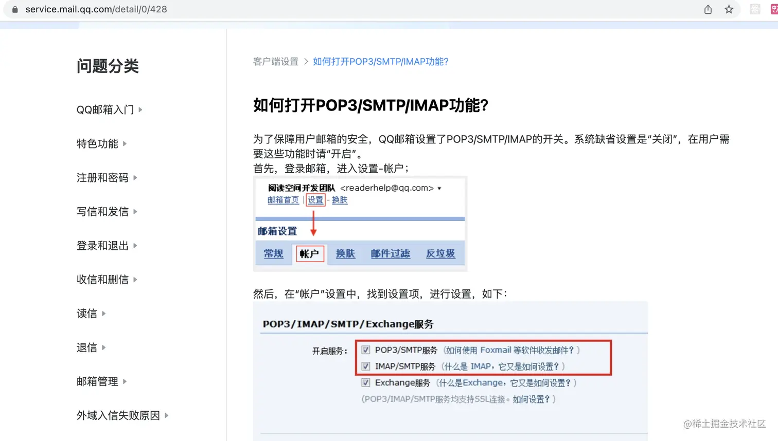在邮箱帮助中心 service.mail.qq.com/ 可以搜到如何开启 smtp、imap 等服务: