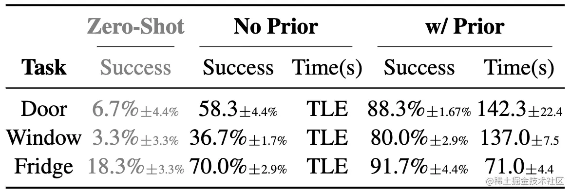 尽管在接触丰富的任务中存在一定的局限性,但 VoxPoser 可以作为先验知识,用于从在线交互中高效学习。从下表 3 的实验结果中可以得到,与没有先验知识的探索相比,VoxPoser 能够在不到 3 分钟的时间内学会打开各种具有复杂结构的关节物体。这种先验知识的应用使得学习过程更加高效,并且为机器人在面对具有复杂结构的物体时提供了更好的操控能力。