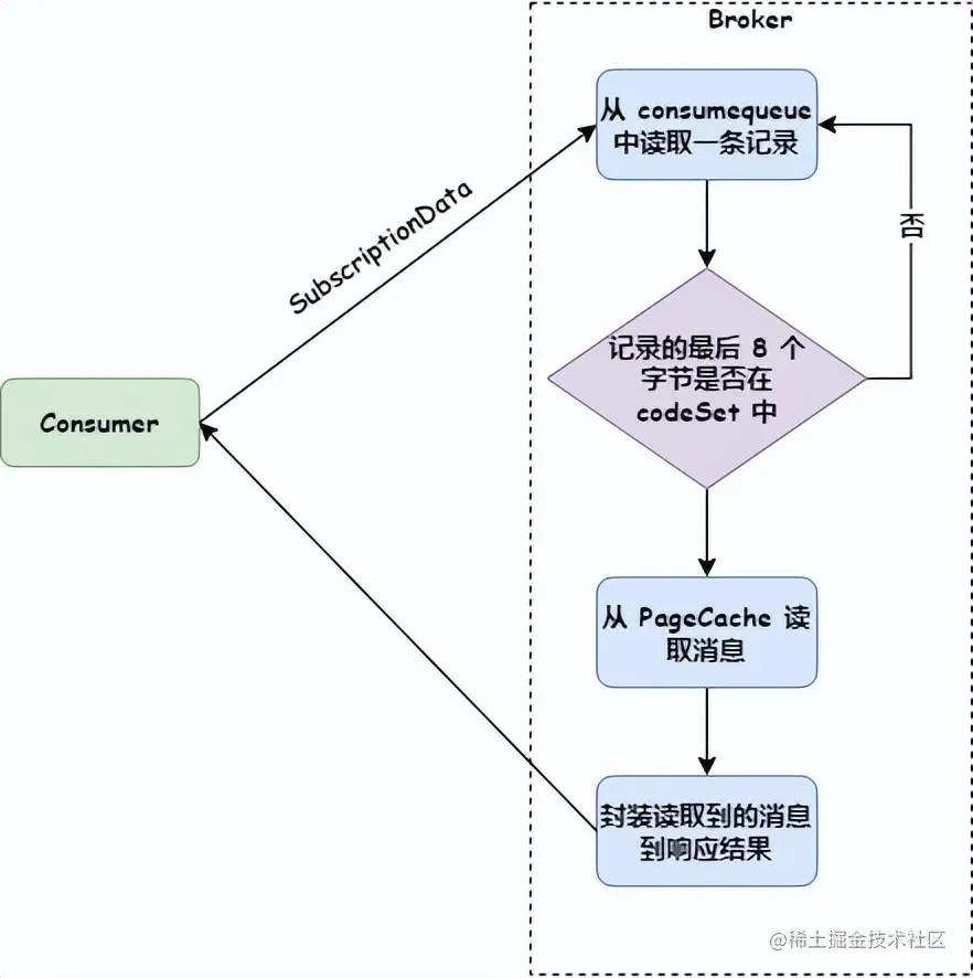 Consumer 发送拉取消息请求时,会把订阅关系传给 Broker(Broker 解析成 SubscriptionData 对象),Broker 使用 consumequeue 获取消息时,首先判断判断最后 8 个字节的 tag hashcode 是否在 SubscriptionData 的 codeSet 中,如果不在就跳过,如果存在把消息返回给 Consumer。如下图: