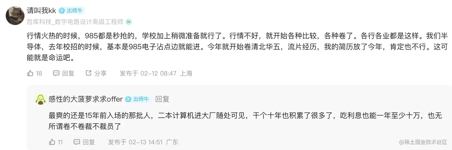 大厂缩招,于是很多往年能进大厂的人只能去卷中小厂,搞得层层内卷。 比如往年能有一万个人能进大厂,今年大厂只招聘一千个,那另外九千个在往年有大厂水平的人就要去和水平相对普通一些的求职者争夺中小厂的名额了。而且,大厂不好过的话,中小厂也是一样的,甚至更惨。这就又导致很多中小厂的招聘同样减少了。