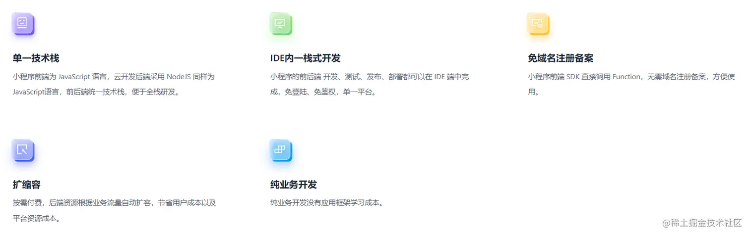 - Serveless架构,自动提供包括云函数、数据库、文件存储、静态托管、缓存等一整套后端服务,简化开发流程;