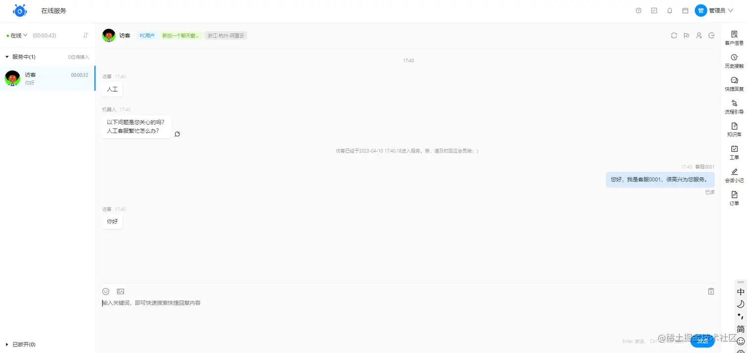 如下图所示,在蚂蚁智能客服后台可进行消息回复、问答库管理、咨询数据查看、接线分配等。