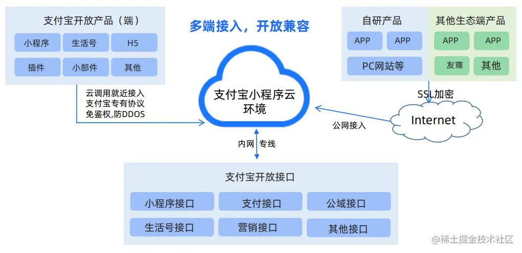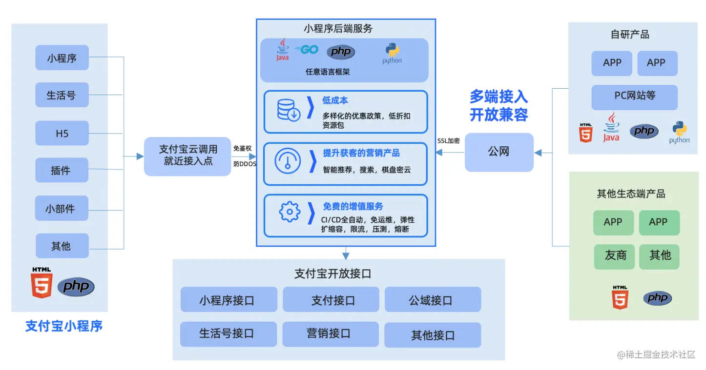 支付宝小程序云是蚂蚁集团提供的以云原生高可用为基础的,降低成本、免运维、高并发业务支撑的服务端解决方案,支持多端接入。