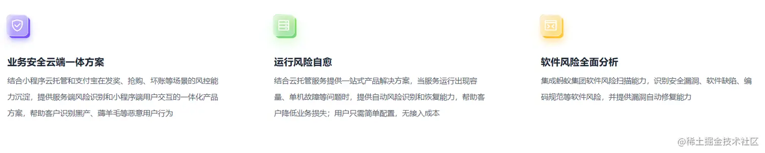 - 业务安全托管:基于强大的大数据智能风控能力,针对小程序用户的商业行为和行业领域,提供一站式业务安全解决方案。