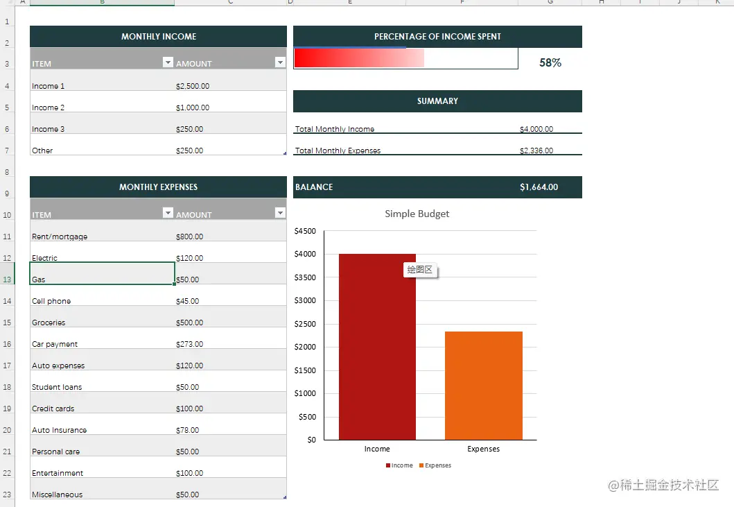 worksheet.getRange("E2").setValue("PERCENTAGE OF INCOME SPENT");